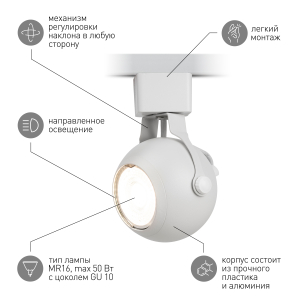 Описание: Однофазный трековый светильник под лампу с цоколем GU10. Светильник выполнен из металла, корпус имеет форму шара, установленного на карданный держатель. Плавные формы и многообразие цветов исполнения делают светильник TR35 идеальным кандидатом на роль акцентного света в вашем проекте.