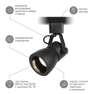 Описание: Однофазный трековый светильник под лампу с цоколем GU10. Корпус светильника выполнен из алюминия, декоративные элементы - из пластика. Особенность данной модели состоит в наличии глубоко утопленной лампы, что снижает эффект ослепления и делает пребывание под таким источником света максимально комфортным. Макс. мощность лампы 15W.