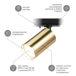Описание: Однофазный трековый светильник под лампу GU10. Особенностью модели является современный утопленный трековый адаптер, который скрыт в шинопроводе и не отвлекает на себя внимание. Также модель комплектуется "Г" образным держателем, который визуально приближает светильник к шинопроводу, делая его эстетически более привлекательным. На тыльной части светильник имеет вентиляционные прорези для отвода горячего воздуха. Максимальная мощность лампы не должна превышать 15W.