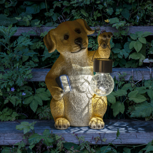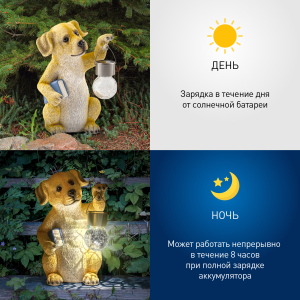 Описание: Фигурка садовая декоративная ЭРА "Умный пёс" станет эффектным обитателем Вашего загородного участка! Этот уличный светодиодный светильник можно разместить на даче - украсить им террасу, альпийскую горку, подсветить тропинку или теплицу. Фигурка ERASF22-09 высотой 27 см выполнена из полистоуна, все детали хорошо проработаны. Беспроводной садовый фонарь работает на солнечных батареях, такой тип получения энергии является самым экологичным, энергоемким, а также бесшумным. Питание происходит во включенном режиме в солнечную погоду, с наступлением ночи фигурка сама включается и работает до 8 часов. При желании фонарик можно снять с лапки пса. Холодное свечение шара сделает ваш вечер очень атмосферным!