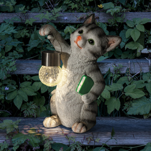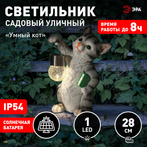 Описание: Фигурка садовая декоративная ЭРА "Умный кот" станет забавным обитателем Вашего дачного участка! Этот уличный светодиодный светильник можно разместить в саду, украсить им кустарник, альпийскую горку, подсветить тропинку или террасу на даче. Беспроводная фигурка ERASF22-10 высотой 28 см выполнена из полистоуна и максимально детализирована. Садовый фонарь работает на солнечных батареях, такой тип получения энергии является самым экологичным, энергоемким, а также бесшумным. Питание происходит во включенном режиме в солнечную погоду, с наступлением ночи фигурка сама включается и работает до 8 часов. При желании фонарик можно снять с лапки котика. Теплое свечение шара сделает ваш вечер самым уютным!