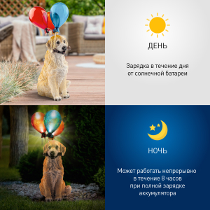 Описание: Фигурка садовая декоративная ЭРА ERASF22-05 "Золотистый ретривер - щенок" станет очаровательным обитателем Вашего загородного дома! Этот уличный светодиодный светильник оживит пейзаж на дачном участке - разместите его в палисаднике, украсьте террасу, клумбу, кустарник, интересно подсветите аллею или вход в дом. Фонарь ERASF22-05 высотой 48 см выполнен из полистоуна, все детали хорошо проработаны. Беспроводной садовый светильник работает на солнечной батарее, этот тип получения энергии является самым экологичным, энергоемким, а также бесшумным. Питание происходит во включенном режиме в солнечную погоду, фигурка сама загорается, как только стемнеет, и работает до 8 часов. Разноцветные воздушные шарики с подсветкой понравятся и детям, и взрослым!