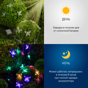 Описание: Садовая гирлянда ERASF22-15 Бабочки 5.8 м от бренда ЭРА станет симпатичным декором Вашего загородного участка! Этот уличный светодиодный светильник внесет игривости и легкости в атмосферу Вашего сада - разместите его на дереве, осветите кустарник или вход в дом. Состоит из 20 прозрачных фигурок в виде бабочек, подсвеченных светодиодами с разноцветным свечением. Гирлянда функционирует на солнечной батарее - этот тип получения энергии является наиболее экологичным, энергоемким, а также бесшумным. Питание происходит во включенном режиме, днем, а с наступлением ночи гирлянда автоматически загорается и радует Вас до 8 часов. 2 режима - постоянный и мигающий - позволят создать атмосферу праздника. Садовый светильник можно оставлять на улице в непогоду, благодаря высокой степени пыле- и влагозащиты IP44. Уличная гирлянда на солнечной батарее от компании ЭРА - оригинальный вариант для преображения площади сада.