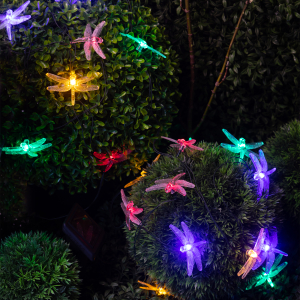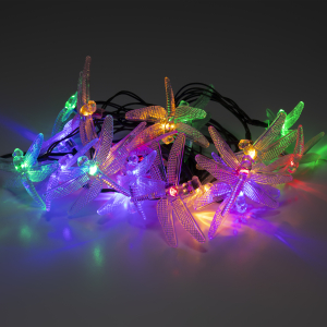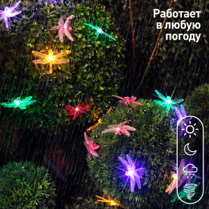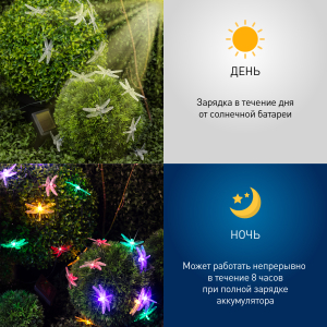 Описание: Уличная гирлянда ERASF22-16 Стрекоза 5.8 м от бренда ЭРА станет изящным украшением Вашего дачного участка! Этот светодиодный светильник внесет оригинальности и легкости в атмосферу сада - повесьте его на кустарник, осветите беседку или вход в дом. Состоит из 20 прозрачных фигурок в виде стрекоз, подсвеченных светодиодами с разноцветным свечением. Гирлянда работает на солнечной батарее - такой тип получения энергии является наиболее экологичным, энергоемким, а также бесшумным. Питание происходит во включенном режиме, днем, а с наступлением ночи гирлянда автоматически загорается и работает до 8 часов. 2 режима свечения - постоянный и мигающий - позволят создать праздничное настроение. Садовый светильник можно оставлять на улице в плохую погоду, благодаря высокой степени пыле- и влагозащиты IP44. Садовая гирлянда на солнечной батарее от компании ЭРА - идеальный вариант для декорирования площади сада.