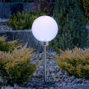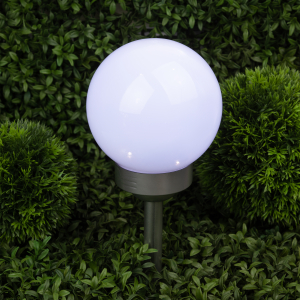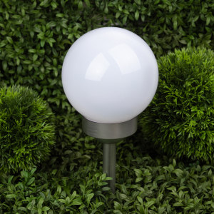 Описание: Классическая модель садового светильника в виде сферы. Мягкое свечение холодного белого света послужит прекрасным украшением при оформлении садовых дорожек и клумб.