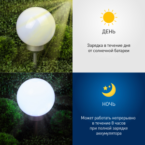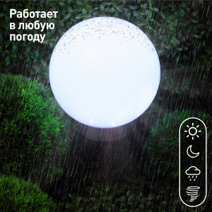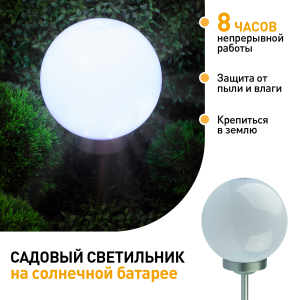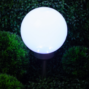 Описание: Классическая модель садового светильника в виде сферы. Мягкое свечение холодного белого света послужит прекрасным украшением при оформлении садовых дорожек и клумб.