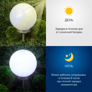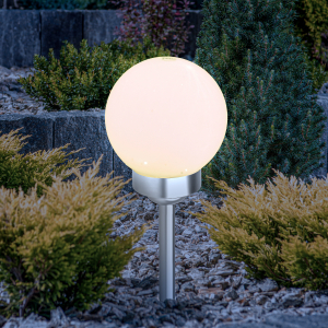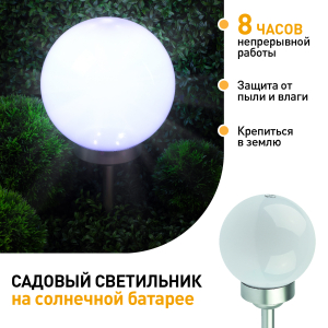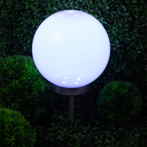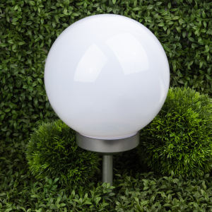 Описание: Классическая модель садового светильника в виде сферы. Мягкое свечение холодного белого света послужит прекрасным украшением при оформлении садовых дорожек и клумб.