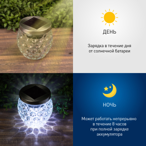 Описание: Садовый светильник Хрустальный шар имеет белое свечение, и прекрасно подойдет для освещения террасы, беседок, дорожек и клумб. Диаметр 10 см. Белое свечение светодиодов.
