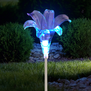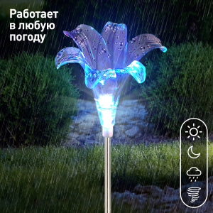 Описание: Садовый светильник ЭРА ERASF22-19 (арт. Б0053379) отличает элегантный дизайн в виде прозрачной лилии с разноцветным RGB-светом. Высота уличного светильника - 75 см. Диаметр цветка - 10 см. Солнечная батарея, закреплённая на стойке светильника, накапливает энергию для 8 часов свечения в тёмное время суток. Уличный садовый светильник может применяться в любую погоду, так как отлично защищён от влаги и пыли - IP44. Светодиодная лилия - идеальное дополнение палисадника, клумбы. Яркий разноцветный RGB-светильник уличный в виде цветка хорошо смотрится у фасада дома, у садового пруда, у забора. Особого эффекта можно достичь, купив несколько штук и разместив такие садовые светильники в составе группы.