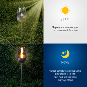 Описание: Фигурка садовая декоративная ЭРА ERASF22-37 "Идеал" станет элегантным украшением вашего загородного дома! Этот уличный светодиодный светильник легко втыкается в землю - его можно разместить в саду, украсить им пруд, альпийскую горку, подсветить тропинку или периметр участка. Садовый фонарь высотой 32 см выполнен из металла серебристого цвета и прозрачного пластика. Беспроводной светильник работает на солнечной батарее, этот тип получения энергии является самым экологичным, энергоемким, а также бесшумным. Питание происходит во включенном режиме в солнечную погоду, фигурка автоматически включается с наступлением ночи и работает до 8 часов. Имитация горения свечи и мягкий свет сделают ваш вечер теплым и изысканным!