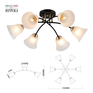 Rivoli Brenda (арт. 9099-306) - люстры потолочные из металла и стекла. Созданы дизайнерами итальянского бренда Rivoli. Люстры Brenda отличает традиционный дизайн, который подойдет для большинства интерьеров. Стеклянные плафоны люстры в гостиную Rivoli Brenda имеют форму колокольчика, их матовое покрытие делает свет более мягким. Поэтому люстры Brenda хороши и в спальню, и в детскую. Освещаемая площадь одной такой люстры - 18 м². Для данной люстры стоит купить 6 ламп Е27 мощностью 60 Вт. В коллекции есть люстры потолочные побольше - под 8 ламп (арт. 9099-308).