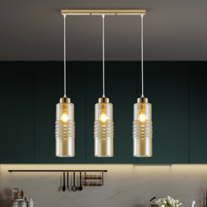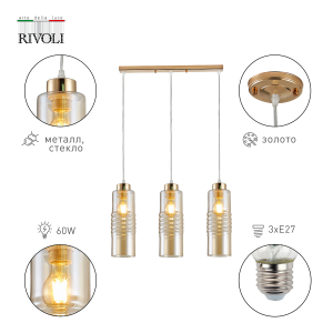 Rivoli Viviane - подвесные светильники для кухни, подвесные светильники над столом, подвесные светильники на тросах. Данную модель отличает удлиненный дизайнерский плафон из стекла с теплым тонированием и лаконичным выдувным декором. Подвесные светильники Viviane созданы итальянским брендом Rivoli для стиля модерн. Могут использоваться как подвесные светильники для стиля лофт, подвесные светильники для стиля ретро. Основание и фурнитура светильников потолочных подвесных Rivoli Viviane изготовлены из прочного металла, подвес светлый, малозаметный. В коллекцию входят светильники подвесные с 3 стеклянными плафонами (арт. 9107-203) и подвесной светильник-люстра с 1 стеклянным плафоном (арт. 9107-201).
