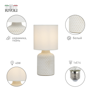 Rivoli Sabrina (арт. 7043-502) - настольный светильник бытовой интерьерный с тканевым абажуром. Дизайн создан в Италии в соответствии с современными тенденциями оформления интерьеров.