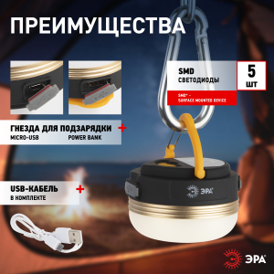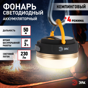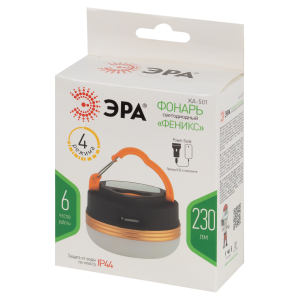 Описание: ЭРА KA-501 "Феникс" - компактный кемпинговый фонарь с удобным креплением для подвешивания. Работает от встроенного аккумулятора, USB-кабель для подзарядки в комплекте. Яркий качественный свет создают 5 светодиодов нового поколения. Эргономичный круглый корпус изготовлен из легкого ударопрочного пластика. Одной подзарядки хватает на 6 часов непрерывного свечения. Несмотря на малый размер, отличается хорошим световым потоком - 230 Лм. В зависимости от ситуации выбирайте режимы работы: 1) 100% яркость, 2) 50% яркость; 3) стробирование; 4) SOS. Мощность этого удобного фонарика - 3 Вт. Важное преимущество - фонарь можно использовать как powerbank, подзаряжая от него мобильные устройства. После полной подзарядки непрерывно светит 6 часов. Кемпинговый фонарик ЭРА "Феникс" защищен от влаги и пыли (IP44), он обеспечит вас надежным освещением в любую погоду!