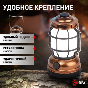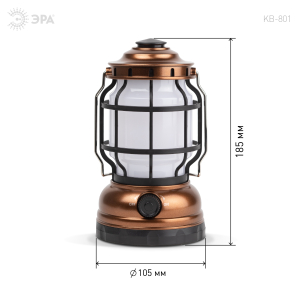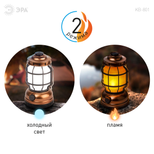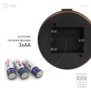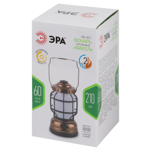 ЭРА КВ-801 «Факел» - светодиодный кемпинговый фонарь в ретро-стиле. Светит в 2 режимах – холодный белый свет и режим теплого пламени. Работает от 3 пальчиковых батареек (3 х АА). Одного комплекта алкалиновых элементов питания хватает на 60 часов непрерывного свечения.