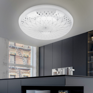 Восхитительный дизайн плафона создаст приятную обстановку в Вашем доме. Узор из переплетающихся линий прекрасно сочетается с круглым плоским корпусом. Крохотные звезды, разбросанные по окружности рассеивателя, придают светильнику динамики. Такая LED люстра идеальна для оформления света детской, гостиной или спальне.