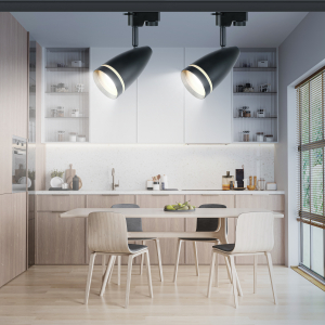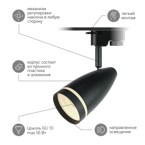 Описание: Однофазный трековый светильник под лампу с цоколем GU10. Светильник выполнен из алюминия и пластика. На передней части плафона, выполненного в виде конуса, расположено декоративное акриловое кольцо, которое наполняется светом и придает светильнику превосходный внешний вид.