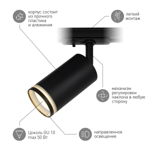 Описание: Однофазный трековый светильник под лампу с цоколем GU10. Светильник выполнен из алюминия, комплектуется утопленным трековым адаптером, который погружается в трековый шинопровод. На передней части светильника установлено акриловое кольцо, которое наполняется светом во время работы изделия.