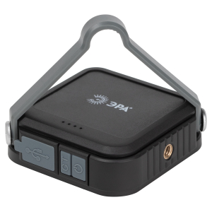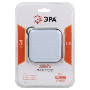 ЭРА PA-807 - компактный светодиодный фонарь-powerbank с 6 режимами работы, поворотной ручкой и удобным креплением для подвешивания. Квадратный корпус (90 х 90 х 30 мм) из легкого ударопрочного пластика обеспечивает эффектный внешний вид фонаря и комфорт при использовании. Поворотную ручку можно использовать как подставку, чтобы устанавливать фонарь на столе.