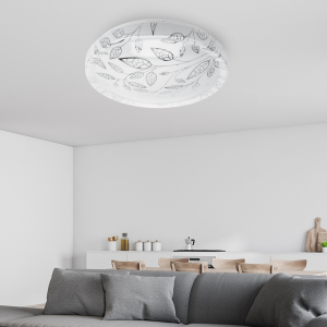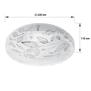 Плафон LED люстры декорирован изящным узором. Нежные ветки с лепестками гармонично смотрятся на круглом плоском корпусе. Такой светильник прекрасно подойдет для оформления гостиной, коридора, спальни или детской.