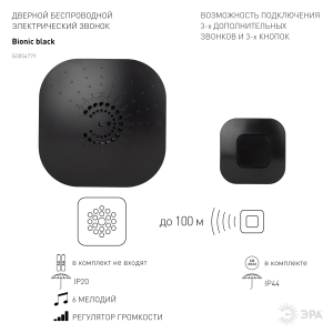 Описание: Новый дверной звонок популярной серии беспроводных звонков ЭРА BIONIC. Красивый аккуратный звонок на дверь разработан в России дизайн-центром ЭРА. Подходит для квартир, домов, загородных участков. Защищен от влаги и пыли. К одной кнопке можно подключить много динамиков и наоборот - к одному динамику несколько кнопок. Их можно объединить и в общую сеть, если у вас несколько калиток и строений на одном участке: все кнопки подключаются ко всем динамикам. Радиус действия достигает 100 метров. ЭРА BIONIC идеален для дачи: быстрая установка, возможность создания единой системы из нескольких звонков и кнопок, кнопки защищены от неблагоприятных погодных условий IP44. Звонок не зависит от наличия электроэнергии, он работает от батареек: динамик от 2 пальчиковых (2 х АА, в комплект не входят), кнопка - от СR2032 (в комплекте). Дополнительный бонус электрозвонка ЭРА BIONIC - после его установки не нужно ломать голову, куда спрятать провода. Серия ЭРА BIONIC представлена в разных цветах: белый (арт. Б0017748) , черный (арт. Б0054779), серебро (арт. Б0017749) , дерево (арт. Б0018089), слоновая кость (арт. Б0018090), шампань (арт. Б0018091). Эти современные звонки на дверь прекрасно впишутся в интерьер и сделают быт комфортным.