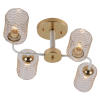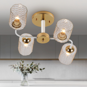 Описание: Элегантная люстра в сочетании золота и белого с прозрачными плафонами, украшенными металлической сеткой. Идеально подходит для создания современной атмосферы в интерьере. Оснащена 4 рожками с цоколем E27 (макс. 40 Вт), что позволяет использовать различные лампы для мягкого и уютного освещения.