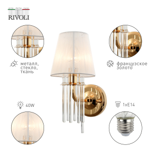 Бра Rivoli Lilith (арт. 1039-401) - светильник настенный цвета французское золото с тканевым абажуром и декоративными стеклянными колбами. Бра настенное Lilith освещает площадь 3 м2 и идеально для организации дополнительного освещения в спальне, в гостиной. Ткань бра - специальная абажурная, не скапливает пыль, устойчива к выцветанию и загрязнениям. Полупрозрачная текстура абажура бра отлично пропускает свет. Рекомендованная лампа - Е14 40 Вт.