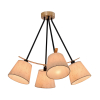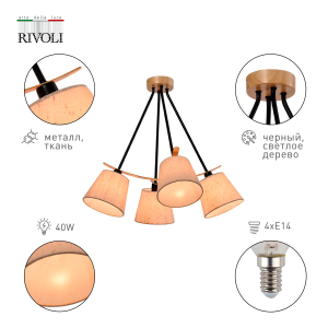 Люстры потолочные Innominata представляют линейку модерн итальянского бренда Rivoli. Это уютные стильные люстры в гостиную, в спальню, на кухню, в загородный дом. Плафоны люстр представляют собой небольшие абажуры диаметром 150 мм. Применена специальная ткань с повышенной защитой – она не впитывает грязь, при уборке достаточно просто смахнуть с люстры пыль. Оригинальный корпус люстр коллекции Rivoli Innominata представляет собой совокупность лаконичных металлических рожков чёрного цвета и декоративного соединительного элемента цвета светлое дерево. Основание люстр также окрашено в цвет дерева.