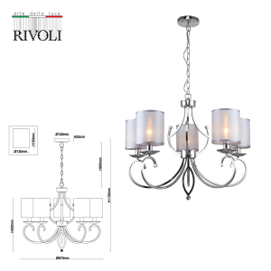 Описание: Люстра с 5 плафонами (арт. 2063-305), люстра с 8 плафонами (арт. 2063-308) и бра (арт. 2063-401) составляют коллекцию Rivoli Amy в классическом стиле. Дизайнерские подвесные люстры Amy от итальянского бренда Rivoli окрашены в трендовый цвет хром гальваническим способом, сохраняющим насыщенность оттенка на долгие годы и защищающим люстры от царапин и сколов. Подвес люстры декорирован цепочкой, при монтаже люстры на потолок длину подвеса можно отрегулировать. Светлые полупрозрачные плафоны из ткани великолепно пропускают свет, делая освещение в комнате мягким и комфортным для глаз. Освещаемая площадь данной люстры – 15 м2. Рожки с плавными завитками и аккуратный декоративный бутон по центру грамотно создают эстетичный облик классической люстры.