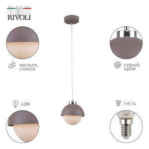 Подвесной светильник Rivoli Clara с регулировкой высоты подвеса. Полукруглый лаконичный плафон подвесной люстры, а также основание люстры изготовлены из металла. Стойкое гальваническое окрашивание люстры-подвеса – серого цвета. Матовый серый светильник подвесной популярен в современных дизайн-проектах. Подвесные люстры над столом – удобное функциональное решение.