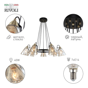 Подвесные люстры Rivoli Cathy подходят для стилей лофт-кантри, современная классика, классика. Люстры на тросах популярны для создания эффектных запоминающихся интерьеров. Высоту подвеса люстры на потолок Cathy легко отрегулировать при монтаже и подключении люстры. В коллекции Rivoli Cathy, созданной итальянскими дизайнерами, люстры под 7 ламп (арт. 5106-307) и люстры под 5 ламп (арт. 5106-305), а также настенный светильник – арт. 5106-401.