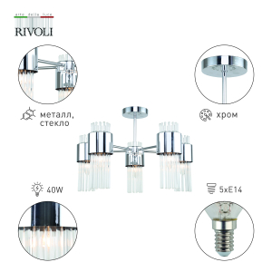 Описание: 5-рожковая люстра на штанге в цвете хром, с трубчатыми стеклянными плафонами. Люстра потолочная применяется с 5 лампами Е14 мощностью 40 Вт, освещает площадь до 15 м2. Люстра с цилиндрическими плафонами из стекла будет удачно смотреться в гостиной, в спальне, на кухне, в кабинете, в загородном доме. Люстры и светильники коллекции Rivoli Deborah подходят для оформления пространств сегмента horeca – рестораны, кафе, гостиницы. Эти люстры потолочные заказывают в интерьеры театров, концертных залов, фойе общественных пространств. В коллекции Rivoli Deborah: люстра под 5 ламп - арт. 3148-305, люстра под 7 ламп - арт. 3148-307, светильник подвесной - арт. 3148-201, светильник настенный - арт. 3148-401.
