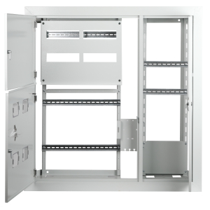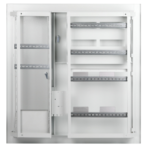 Описание: Щиты этажные металлические ТМ ЭРА SIMPLE предназначены для сборки учетно-распределительных устройств в жилых и общественных зданиях, а также для защиты отходящих линий при перегрузках и коротких замыканиях. Сварной металлический корпус состоит из трех отсеков: вводно-учетного, распределительного, отсека слаботочного оборудования. В вводно-учетном и распределительном отсеках размещены перфорированные DIN рейки для крепления счетчиков (по количеству квартир) рейки для крепления модульного оборудования и монтажная панель для крепления отводов от силового кабеля. Отсек слаботочного оборудования снабжен перфорированными DIN рейками и монтажной панелью для удобной прокладки и монтажа систем теле- и радиосетей, телефонных линий, сетей охранной сигнализации, домофонов. Щиты изготовлены из стали 0,8 -1,2 мм, покрыты полиэфирной порошковой краской RAL 7035 . Размер ниши 876х864х125