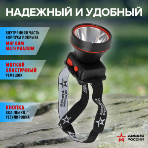 Описание: ЭРА Армия России "Вектор" GA-803 - налобный аккумуляторный LED-фонарь с 3 режимами работы, широким светоотражателем и поворотным корпусом для выбора нужного направления света. Мягкий эластичный ремешок прочно фиксирует устройство на голове и даёт возможность регулировки размера. Вектор отличается повышенной для такого компактного фонаря дальностью светового луча - 230 метров. Удобная подзарядка от USB, простота в управлении и лаконичный стильный дизайн. В основе фонаря - современная LED-технология. ЭРА GA-803 светит ярко, но при этом не ослепляет и не даёт мерцания. Светодиодный элемент снабжён широким светоотражателем для максимального качества освещения. Нужный угол направления света легко выбрать, не снимая устройства с головы - корпус имеет поворотную конструкцию. Кнопка включения расположена в верхней части фонаря. Она позволяет выбрать удобный режим работы - максимальная яркость, стандартный свет и эконом-режим. Для каждой ситуации - свой свет. ЭРА Армия России Вектор идеален для туризма, рыбалки и охоты, строительных, монтажных и ремонтных работ, а также для любых бытовых ситуаций, когда нужно что-то подсветить и при этом руки должны остаться свободными. Внутренняя часть корпуса покрыта мягким материалом - фонарь отлично закреплён, не скользит и не натирает кожу головы. В комплекте эластичный брендированный ремешок с возможностью регулировки размера, что делает изделие абсолютно универсальным. Также вместе с фонарём поставляется компактный провод для удобной подзарядки от USB. Аккумулятор устройства - литиевый. Он обладает повышенной ёмкостью 1400 мАч и гарантирует более 6 часов непрерывной работы после одного полного заряда. Можно смело брать с собой даже в длительные путешествия в тёмное время суток. Отсутствие необходимости обновления батареек делает данный фонарь очень экономичным. ЭРА Вектор является частью специальной серии Армия России - это совестный проект с компанией "Военторг", которая действует по лицензии Министерства обороны РФ.