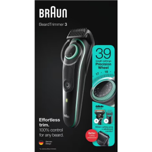 Описание: Триммер для бороды и усов Braun BT3341, 2 насадки и бритва Gillette, мятно-черный Описание товара: Триммер для бороды и усов Braun BT3341 создан для быстрого и эффективного подравнивания бороды и усов. Он оснащен никель-металлогидридным аккумулятором, который рассчитан на 80 минут автономной работы после 8 часов зарядки. Триммер помогает корректировать длину и создавать четкие контуры благодаря острым лезвиям из нержавеющей стали с неограниченным сроком службы. В комплекте идут 2 насадки для создания бороды длиной от 1 до 20 мм. Колесо регулировки имеет 39 настроек длины. Ножи не выдергивают волоски и не создают раздражений. Прочный пластиковый корпус полностью водонепроницаем, что обеспечивает лёгкую очистку триммера под проточной водой. О разрядке батареи и об окончании процесса зарядки подскажет светодиодный индикатор. В комплекте также есть бритва Gillette Fusion ProGlide, обеспечивающая гладкое бритье, и щёточка для чистки прибора триммера. Особенности модели: ー 80 минут работы обеспечивают несколько использований. ー Острые лезвия из нержавеющей стали обладают неограниченным сроком службы. ー 39 установок длины помогают стричь волосы любой длины (1-20 мм). ー Светодиодный индикатор оповещает о разрядке батареи и о восполнении заряда. ー 100% водонепроницаемый. Для лёгкой очистки под водой. Способ применения: сухое бритье Противопоказания / Меры предосторожности: изделие можно промывать проточной водой. перед этим отсоедините его от электропитания. в комплект входит кабель подзарядки со встроенным безопасным источником питания сверхнизкого напряжения. не заменяйте детали и не нарушайте их целостность. несоблюдение этого требования может привести к поражению электрическим током. используйте только специальный кабель питания, поставляемый вместе с изделием. если на прибор нанесена маркировка 492, его можно использовать со всеми источниками питания braun с маркировкой 492-xxxx. никогда не используйте прибор с поврежденными насадками, триммером, гребнями или специа