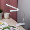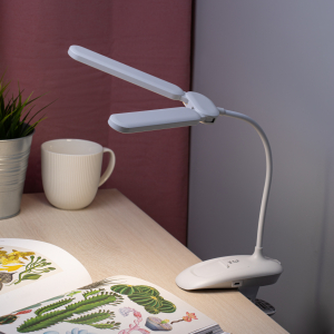 Настольный светильник с двойным плафоном со светодиодами (LED) в качестве источников света. На прищепке. Встроенный литиевый аккумулятор для автономной работы. Выбор цветовой температуры - 3 цвета: 3000К, 4500К, 6000К. Сенсорное переключение. Плавный диммер для регулировки яркости. Подзарядка от USB. USB кабель в комплекте. Гибкая стойка. |