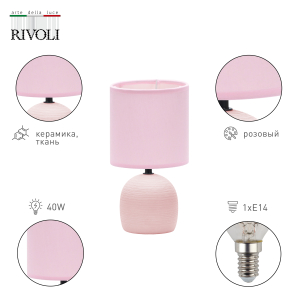 Описание: Rivoli Sheron – настольные светильники итальянского бренда в приятных цветах, способных преобразить любой интерьер. В коллекции: арт. 7067-501 – керамическая розовая лампа на стол, арт. 7067-502 – голубая настольная лампа из керамики, арт. 7067-503 – салатовая лампа настольная с керамическим основанием. Абажур настольных светильников Sheron Rivoli изготовлен из красивой износостойкой ткани с пылеотталкивающими свойствами. Светильник настольный Sheron будет радовать покупателя долгие годы. Удачен этот светильник-ночник и как подарок женщине, подарок ребёнку, подарок новосёлам, подарок другу, подарок коллеге. Популярное решение – купить розовые настольные лампы в детскую комнату. Применяются с лампочкой Е14 мощностью 40 Вт и отлично рассеивают свет.