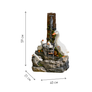 Уличный садовый фонтан со светодиодной подсветкой Green Apple GANF-07 «Гуси» имеет интересный сюжет – купающаяся гусыня с гусятами. Корпус из искусственного камня-полистоуна не раскрошится под прямыми солнечными лучами и осадками. Стойкое окрашивание сохранит красивые естественные цвета фонтана на долгие годы. Фонтан уличный садовый Green Apple «Гуси» выглядит очень реалистично и прекрасно дополняет атмосферу загородного отдыха. Высота фонтана – 59 см.