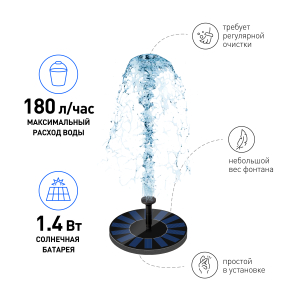 Описание: Green Apple GAPF-01 (арт. Б0057671) – плавающий садовый фонтан с водяным насосом, работающим от встроенной солнечной батареи. Новинка рынка садовых фонтанов! Идеален для декора садового пруда. Водяной поток высотой до 1 метра. Фонтан автоматически заряжается в течение всего светового дня. Мощность солнечной панели – 1,4 Вт. В числе преимуществ минималистичная конструкция, простая сборка и установка, небольшой вес. И конечно – встроенная светодиодная подсветка! Благодаря ярким LED-лампочкам фонтан будет эффектно светиться в вечернее время, преображая пруд и придавая загородной территории волшебный вид. LED-подсветка автоматически включается с наступлением сумерек.