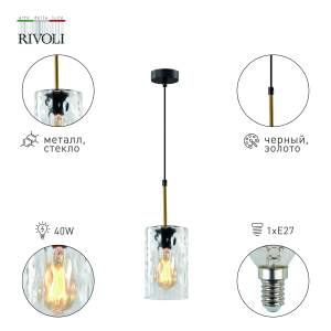 Описание: Широкий ассортимент подвесных светильников итальянского бренда Rivoli представляет новинка – стильный подвес с фигурным стеклянным плафоном Rivoli Alexandra (арт. 4104-201). Кристально прозрачный плафон впечатляет выдувным узором по стеклу. Высоту подвеса светильника на тросе Alexandra можно отрегулировать, сделав данный светильник подвесной максимально подходящим под ваши задачи оформления интерьера. Подвесные светильники итальянского бренда Rivoli – качественное и красивое решение для кухни, спальни, гостиной, кабинета. Подвес светильника подвесного на потолок декорирован дизайнерским элементом золотого цвета. Для светильника потолочного подвесного Rivoli Alexandra необходимо купить лампу Е27 мощностью 40 Вт.