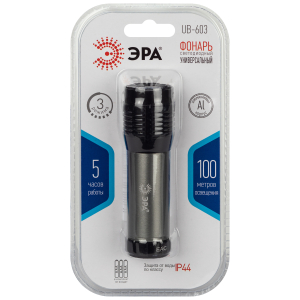 Описание: ЭРА UB-603 – светодиодный ручной фонарь на батарейках. Работает в 3 режимах: максимальная яркость, 50% яркости, стробирование. Защищён от влаги и пыли – IP44. В фонаре установлен яркий светодиод последнего поколения. Мощность данного LED-фонаря – 3 Вт. Удобный ручной фонарик от торговой марки ЭРА создаёт луч дальностью до 100 метров. Регулировка светового луча позволяет использовать фонарь максимально удобно – создавать широкий заливающий свет или ярко подсвечивать конкретную область. Фонарь светодиодный ЭРА UB-603 отличается высоким для портативного фонаря световым потоком – 275 Лм. Источники питания – мизинчиковые батарейки (ААА), 3 шт.