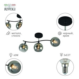 Описание: Rivoli Judy (арт. 3159-303) – люстра потолочная с тремя дымчатыми плафонами на металлической рейке с плавными линиями. Дизайнерская люстра Judy выполнена в стиле модерн. Коллекцию потолочных люстр для гостиной, для кухни, для спальни дополняет модель с двумя плафонами из тонированного дымчатого стекла – арт. 3159-312. Корпус 3-рожковой люстры Rivoli Judy выполнен из металла и имеет стойкое покрытие, нанесённое гальваническим способом. Основной цвет окрашивания люстры – чёрный, присутствуют акцентные хромированные детали. Люстра универсальная Rivoli Judy освещает площадь до 9 м2.