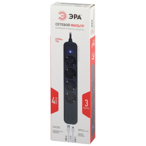 Описание: Сетевой фильтр ЭРА USF-4es-3m-2xUSBAC-B с заземлением, с выключателем, 4 розетки, 2USB, провод 3м, ПВС 3x0,75мм2. Базовый уровень защиты техники: от импульсных помех, от перегрузки, от короткого замыкания. Максимальная мощность 10А/2200 Вт. Корпус из негорючего пластика (полипропилен). Вилка обеспечена кольцом для удобного извлечения ее из розетки. Выключатель со световой индикацией позволяет выключить все приборы, подключенные к сетевому фильтру, не вынимая вилки из розетки. Отлично подойдет для защиты бытовой и компьютерной техники. Сетевой фильтр оснащен 2USB для зарядки мобильных устройств.