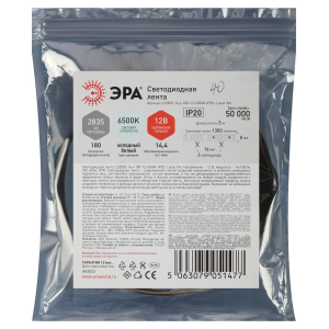 Светодиодная лента ЭРА LS2835 -14,4-180-12-6500K-IP20-1 year-5m холодный белый 5м со степенью защиты от пыли и влаги IP20 - современный способ создания внутреннего освещения, подсветки ниш, лестничного пространства, систем хранения, а также декоративного и художественного оформления любых объектов и форм в помещениях. Легко и быстро устанавливается на любой гладкой поверхности с помощью скотча, расположенного на оборотной стороне ленты. Используя алюминиевый профиль, можно создавать необычные и функциональные решения освещения в Вашем интерьере. Рабочее напряжение ленты составляет 12В, а мощность равна 14,4 Вт/м. Светодиодная лента обладает световым потоком 1300 Лм/м, и цветом свечения - холодный белый (6500 K)