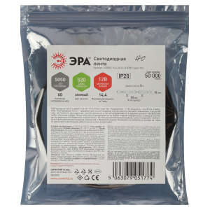 Светодиодная лента ЭРА LS5050 -14,4-60-12-G-IP20-1 year-5m зеленый 5м со степенью защиты от пыли и влаги IP20 - современный способ создания внутреннего освещения, подсветки ниш, лестничного пространства, систем хранения, а также декоративного и художественного оформления любых объектов и форм в помещениях. Легко и быстро устанавливается на любой гладкой поверхности с помощью скотча, расположенного на оборотной стороне ленты. Используя алюминиевый профиль, можно создавать необычные и функциональные решения освещения в Вашем интерьере. Рабочее напряжение ленты составляет 12В, а мощность равна 14,4 Вт/м. Светодиодная лента обладает световым потоком , и цветом свечения - зеленый