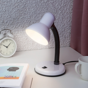 Металлический плафон. Направление света регулируется гибкой стойкой, которая обеспечивает наклон и поворот плафона в любом направлении. Выключатель на прищепке. Классический дизайн.