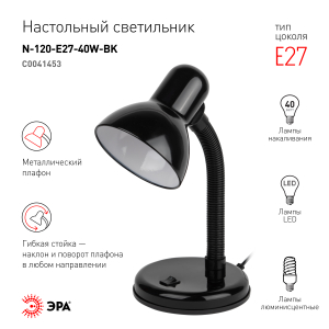 Светильник может использоваться с лампой накаливания, компактной люминесцентной лампой (КЛЛ) или светодиодной (LED) лампой. Устойчивое основание. Металлический плафон. Наклон и поворот плафона в любом направлении. |