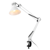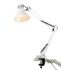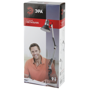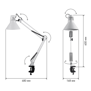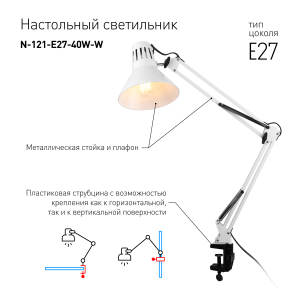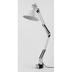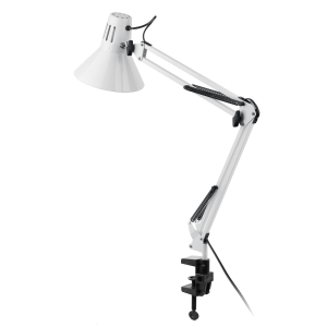 Светильник может использоваться с лампой накаливания, компактной люминесцентной лампой (КЛЛ) или светодиодной (LED) лампой. Надежная пластиковая струбцина для крепления к краю поверхности. Металлические стойка и плафон. Высота плафона регулируется двухсекционной сгибающейся стойкой. Направление света регулируется поворотом и наклоном плафона в любом направлении. |