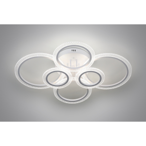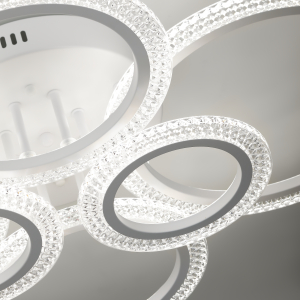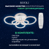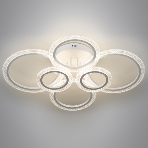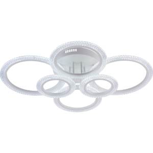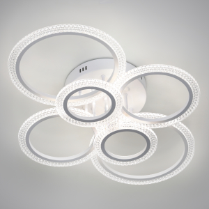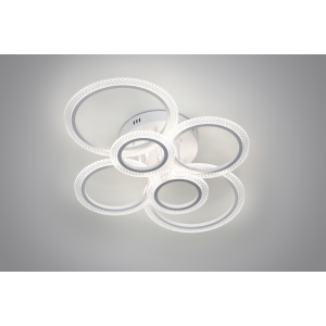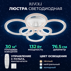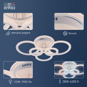 Светильник светодиодный, LED-люстра мощностью 132 Вт. Данную модель большой коллекции Rivoli Marion отличают 6 светодиодных колец различного диаметра. Большая белая светодиодная люстра с пультом ДУ подойдёт на потолок просторной спальни, гостиной, загородного дома, детской комнаты, игровой. Наличие различных световых сценариев (варианты яркости и цветовой температуры освещения) делают этот светодиодный потолочный светильник многофункциональным.