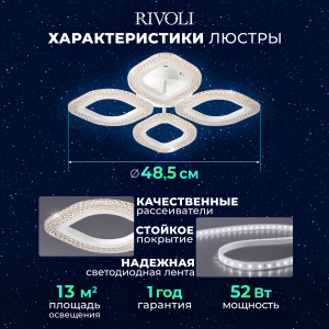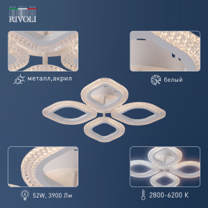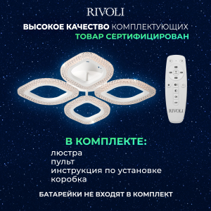 Описание: Этот потолочный светильник Rivoli Megan мощностью 65 Вт предназначен для освещения помещений площадью до 17 м². Цветовая температура регулируется от 2700 до 6000 К, что позволяет создать комфортное освещение для любых условий. Режим ночника обеспечивает мягкий свет в ночное время. Светильник выполнен из акрила, что придает ему современный и стильный вид. В светильнике используются светодиоды нового поколения, обеспечивающие безопасность для глаз. В комплекте все необходимые элементы для установки, включая универсальное крепление для различных типов потолков. Батарейки для пульта не входят в комплект.